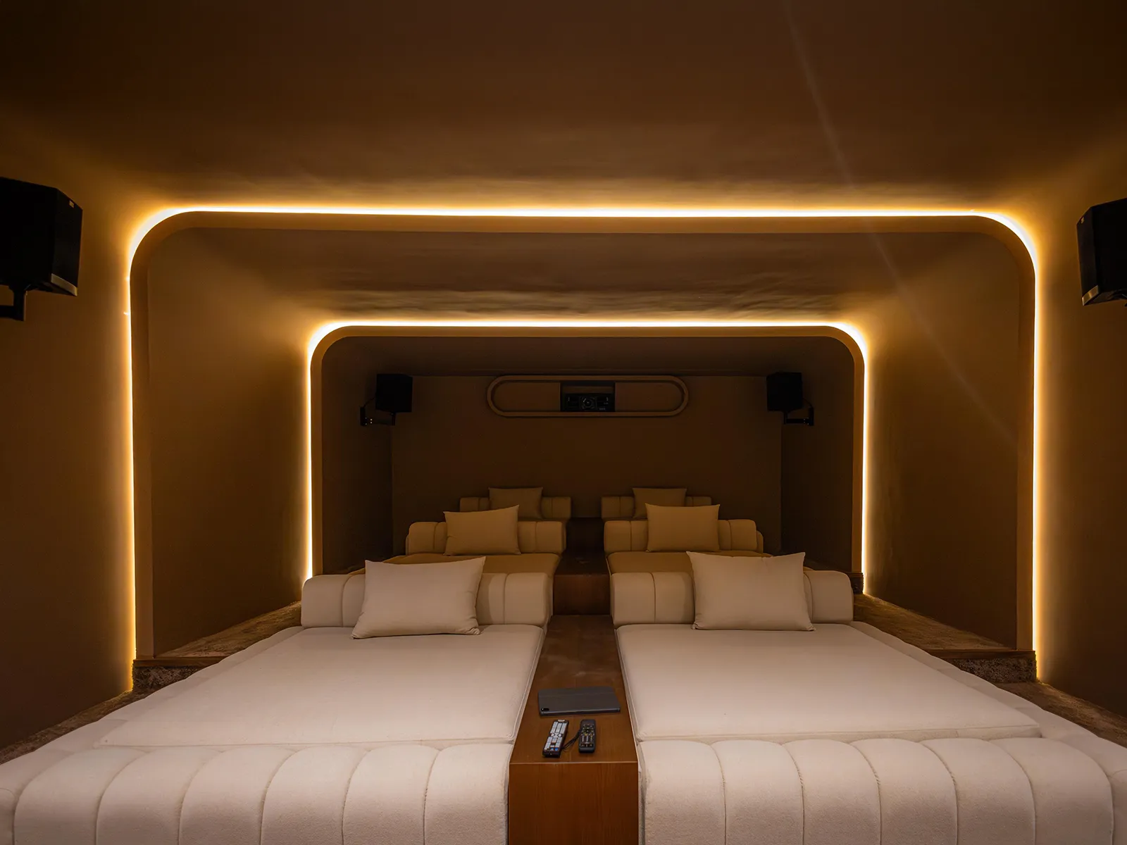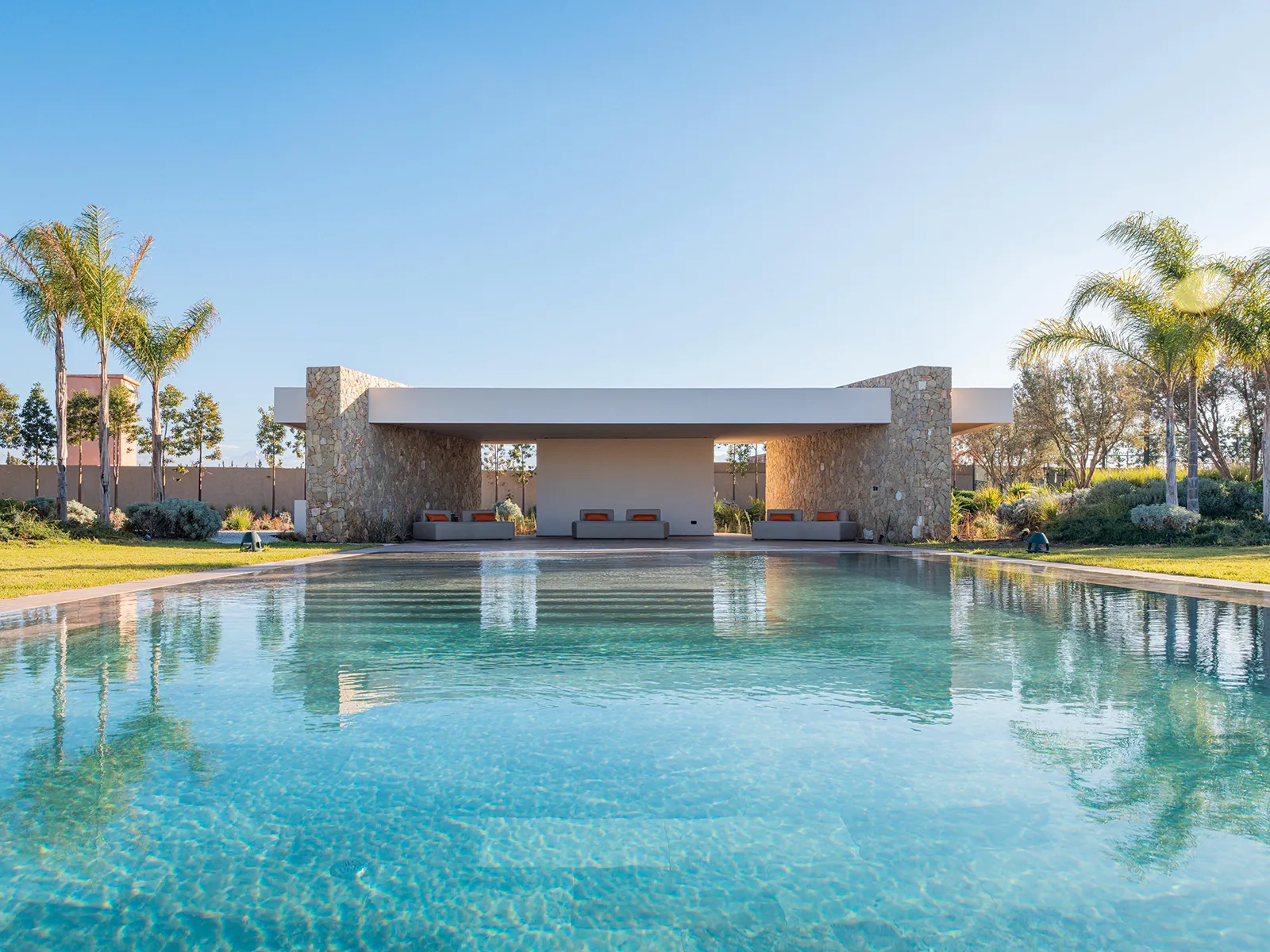 La Villa The One redéfinit la location de villa de luxe à Marrakech. Elle propose des équipements rares : deux salons spacieux, une véritable salle de cinéma privée, un hammam traditionnel, un salon de coiffure et une salle de sport de 60 m². À l’extérieur, le parc d’un hectare accueille une piscine principale de 12×6 mètres, un jacuzzi et un terrain de Padel privé, idéal pour les amateurs de sport souhaitant une villa avec piscine à Marrakech hors du commun.