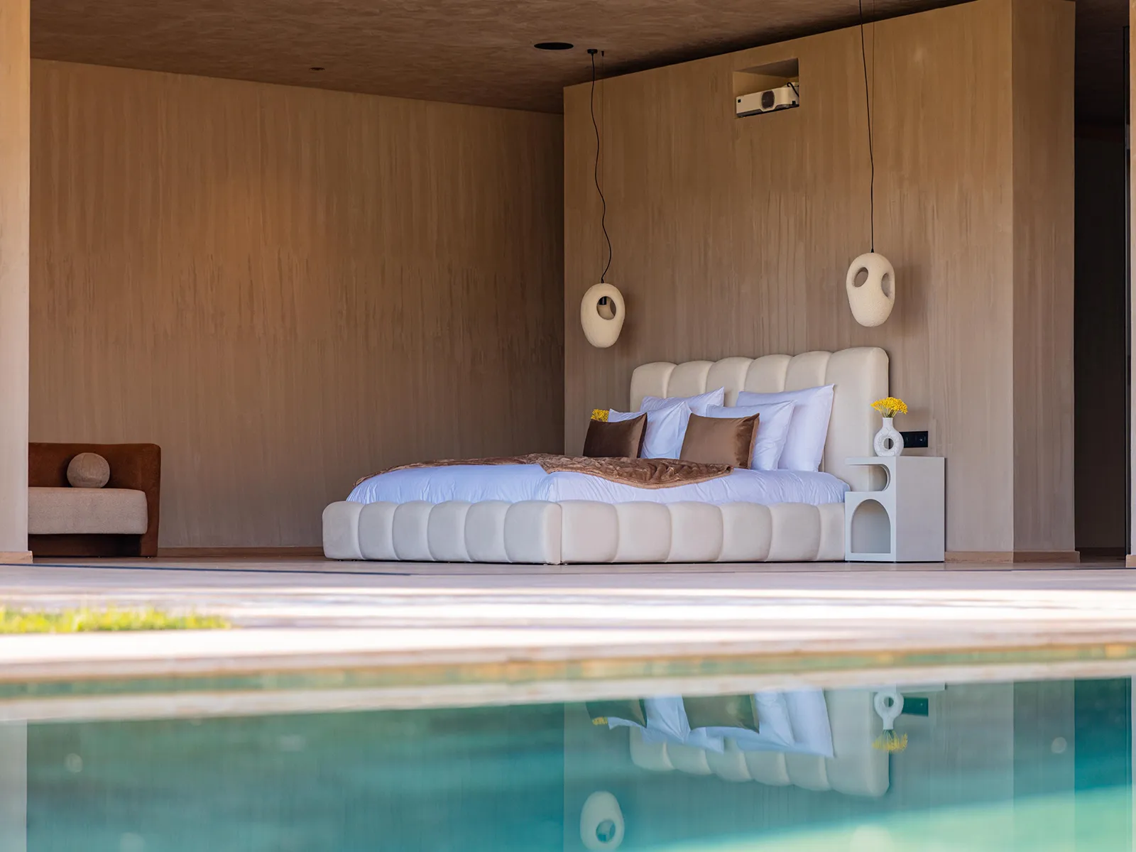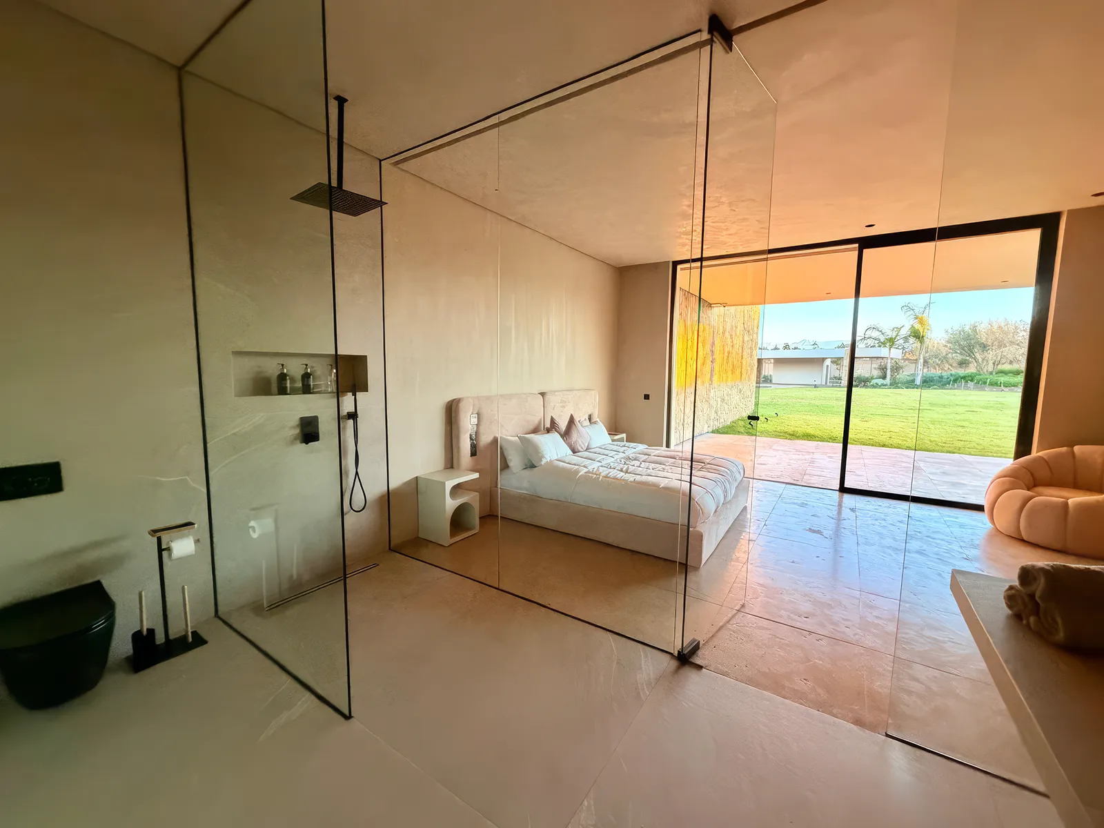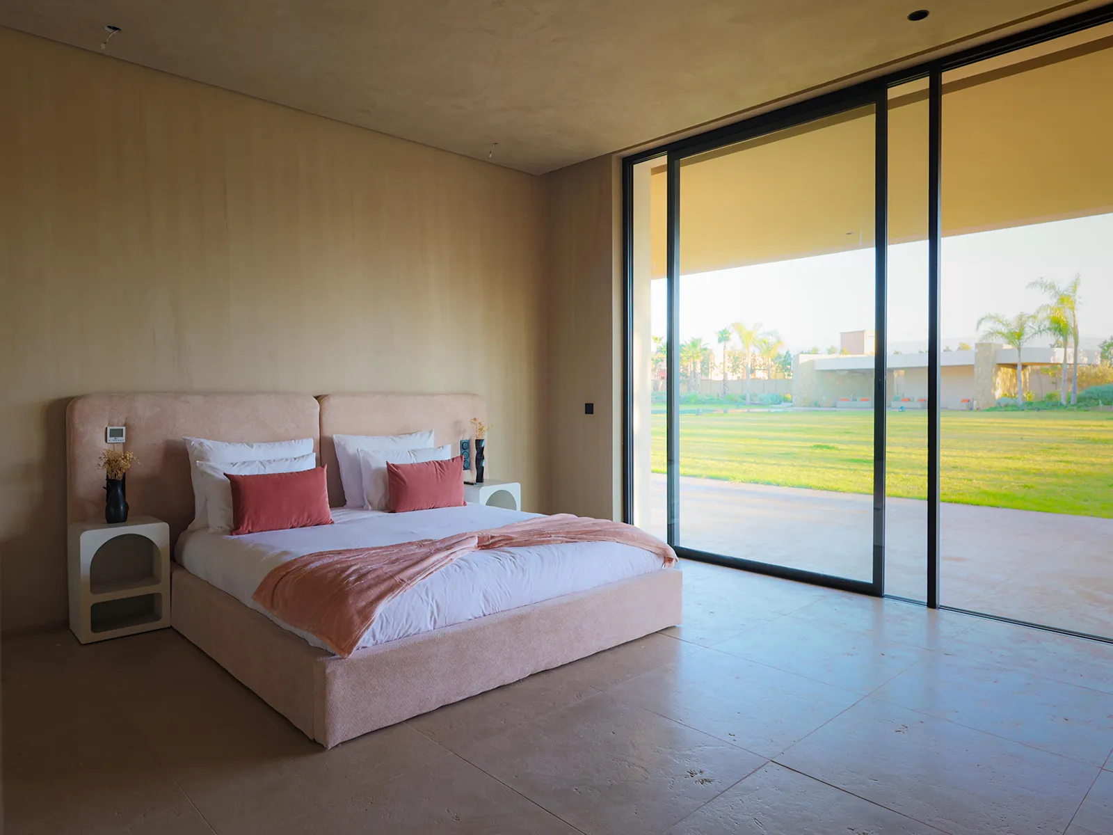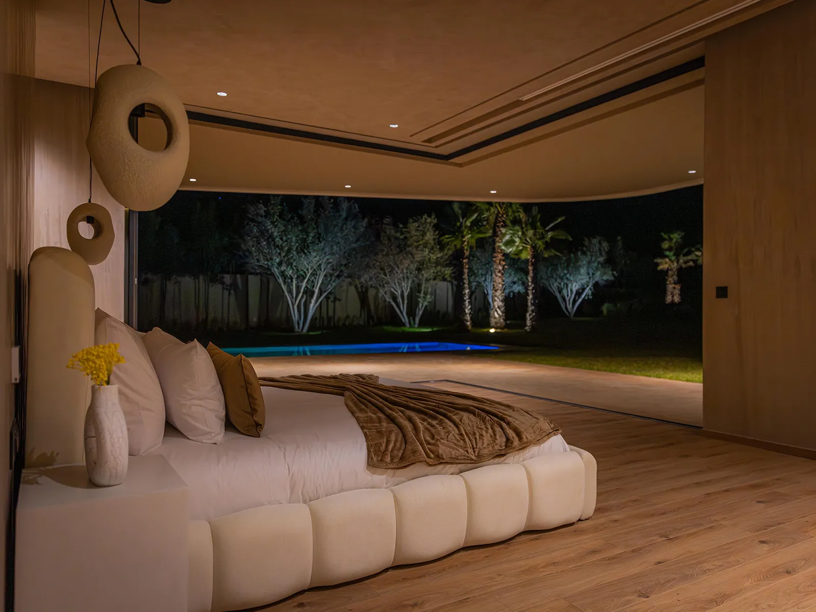L’espace nuit est conçu pour l’intimité absolue. En plus de quatre suites de 35 m², la villa dispose d’une Master Suite de 100 m². Véritable « villa dans la villa », elle possède sa propre salle de bain avec jacuzzi et une piscine privative de 7×4 mètres. C’est la configuration parfaite pour une location villa Marrakech avec 5 chambres de très haut standing.