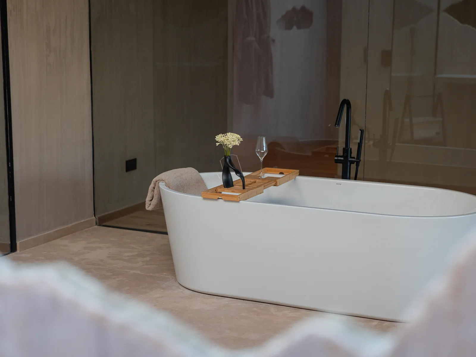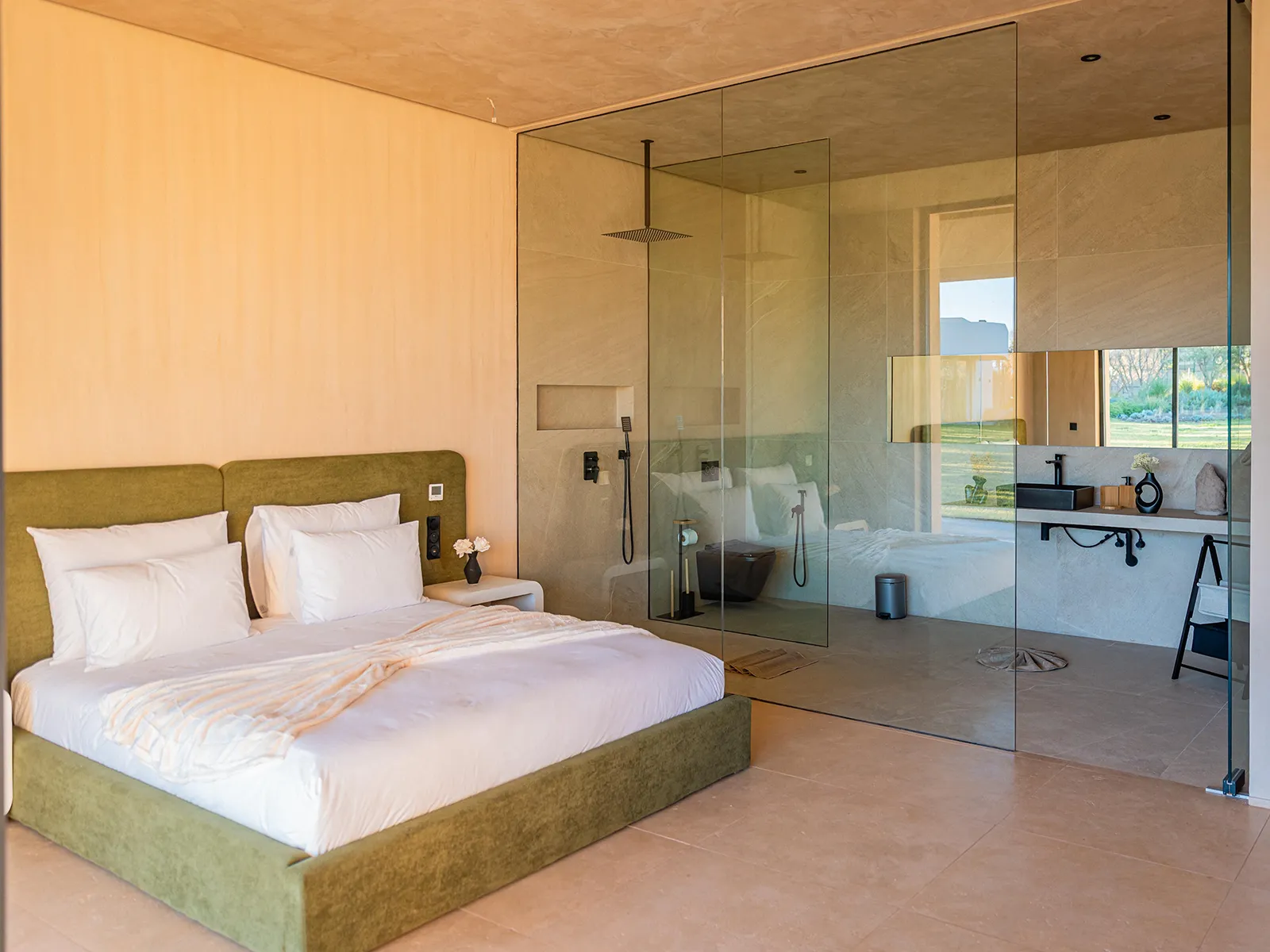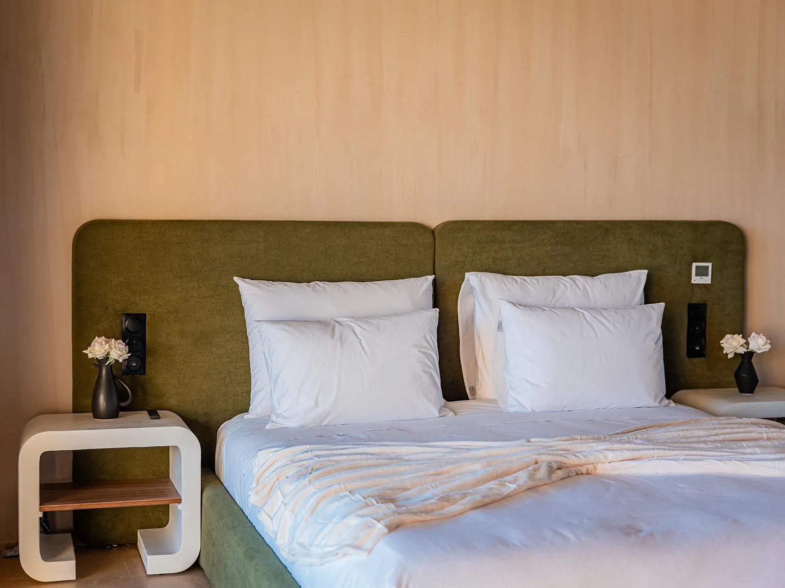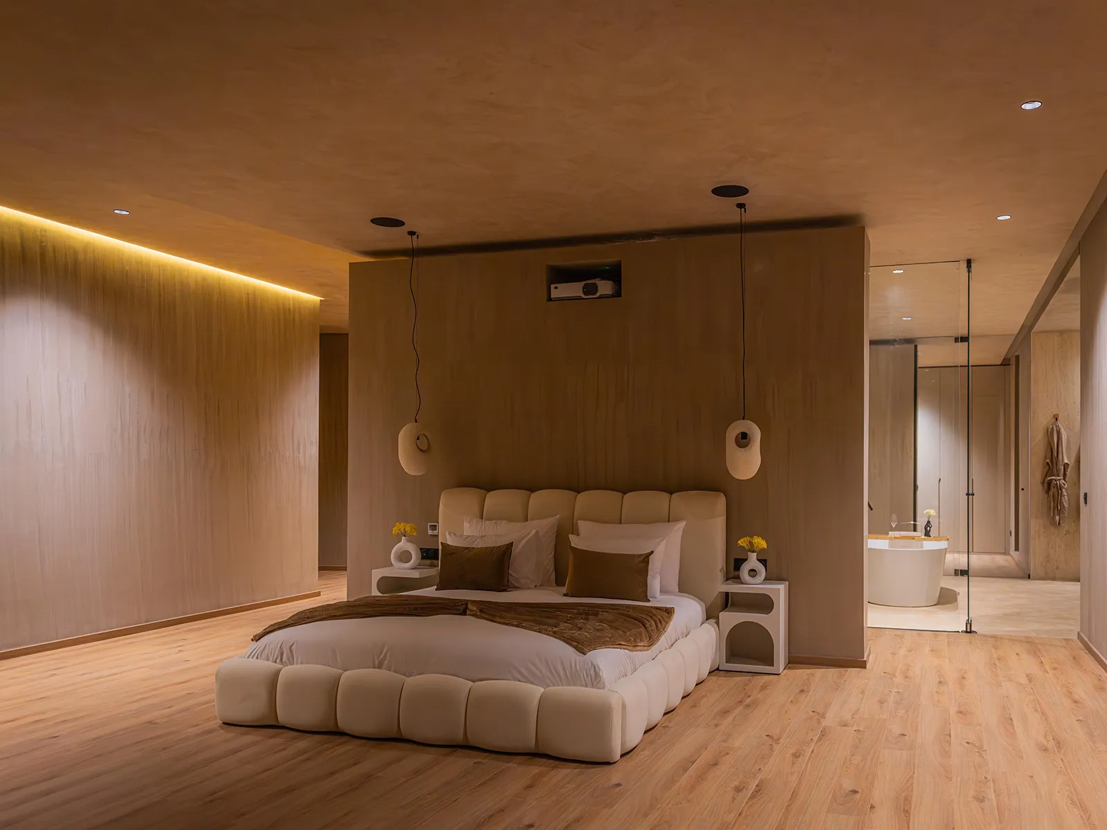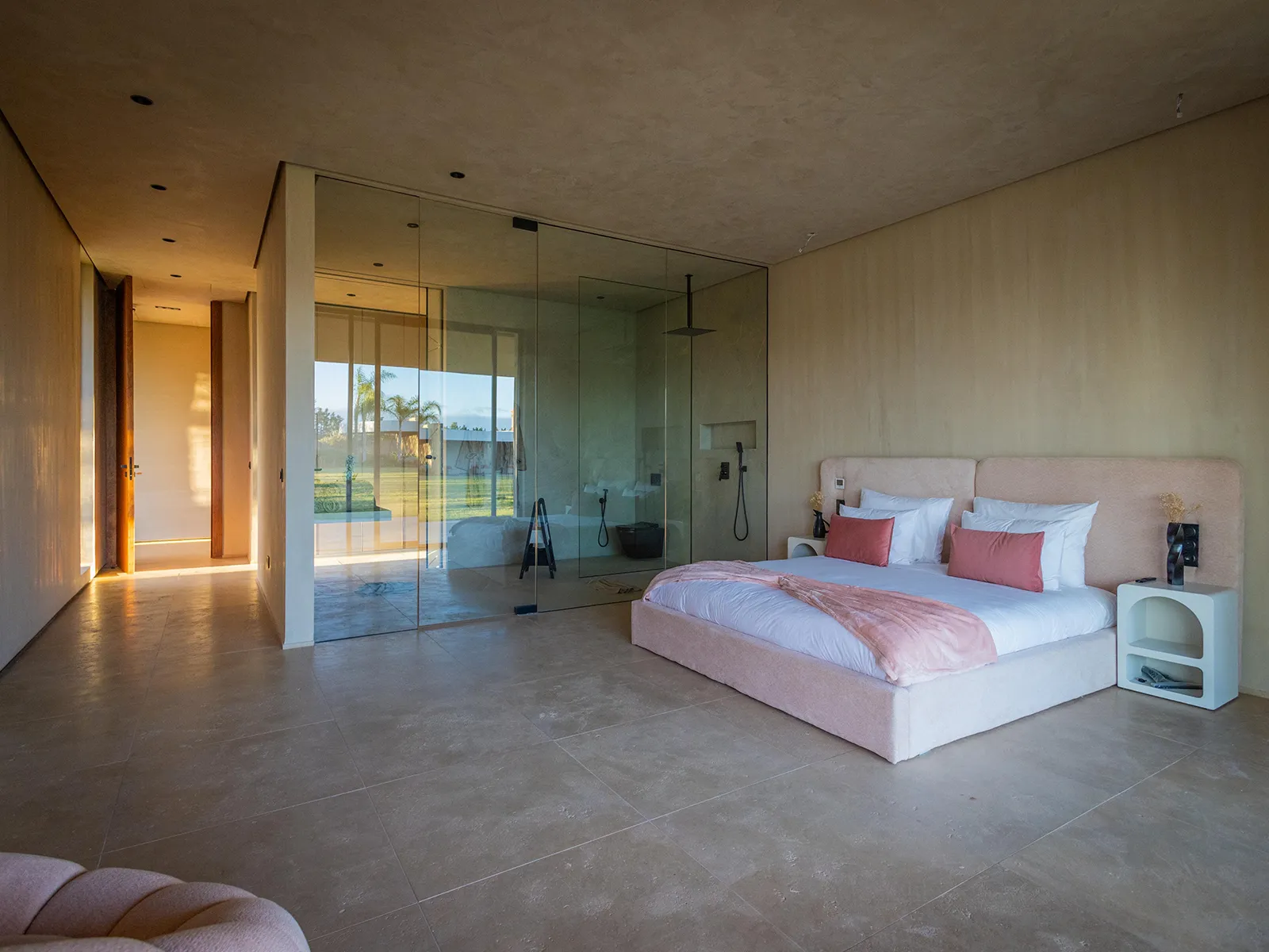 L’espace nuit est conçu pour l’intimité absolue. En plus de quatre suites de 35 m², la villa dispose d’une Master Suite de 100 m². Véritable « villa dans la villa », elle possède sa propre salle de bain avec jacuzzi et une piscine privative de 7×4 mètres. C’est la configuration parfaite pour une location villa Marrakech avec 5 chambres de très haut standing.
